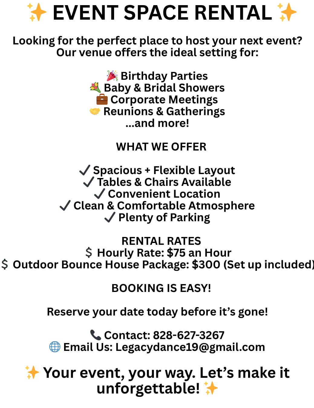 o When exiting, make sure all doors are locked then exit through Dance Express Door (Text 828-734-9757 when you are finished)